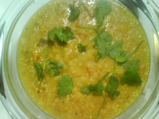 4.Add Tadka to the cooked dal and cook untill it starts bubbling.Take off from the heat and garnish it with cilantro leaves.